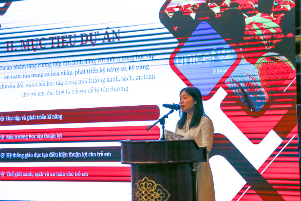 Dự án góp phần tăng cường tiếp cận bình đẳng với môi trường học tập an toàn, tôn trọng và hoà nhập, phát triển kỹ năng số và kỹ năng chuyển đổi, cũng như cơ hội học tập, sống trong một môi trường xanh, sạch và an toàn cho trẻ em và trẻ vị thành niên, đặc biệt là trẻ em dễ bị tổn thương. Trong ảnh: Giám đốc Ban QLCDA – Ông Nguyễn Ngọc Dũng phát biểu khai mạc tại Hội nghị