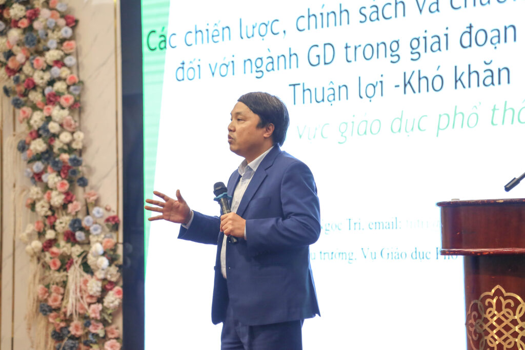 Ông Tạ Ngọc Trí – Phó Vụ trưởng Vụ Giáo dục Phổ thông, Bộ Giáo dục và Đào tạo chia sẻ phần trình bày về chiến lược, chính sách và chương trình nổi bật ngành giáo dục giai đoạn 2027-2031
