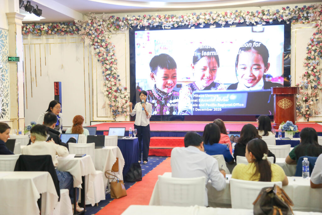 Phần chia sẻ về chiến lược Giáo dục toàn cầu mới – hướng tới tầm nhìn đổi mới trong Giáo dục – học tập và kỹ năng do Bà Mitsue Uemura – Giám đốc Giáo dục UNICEF Khu vực Đông Á Thái Bình Dương trình bày