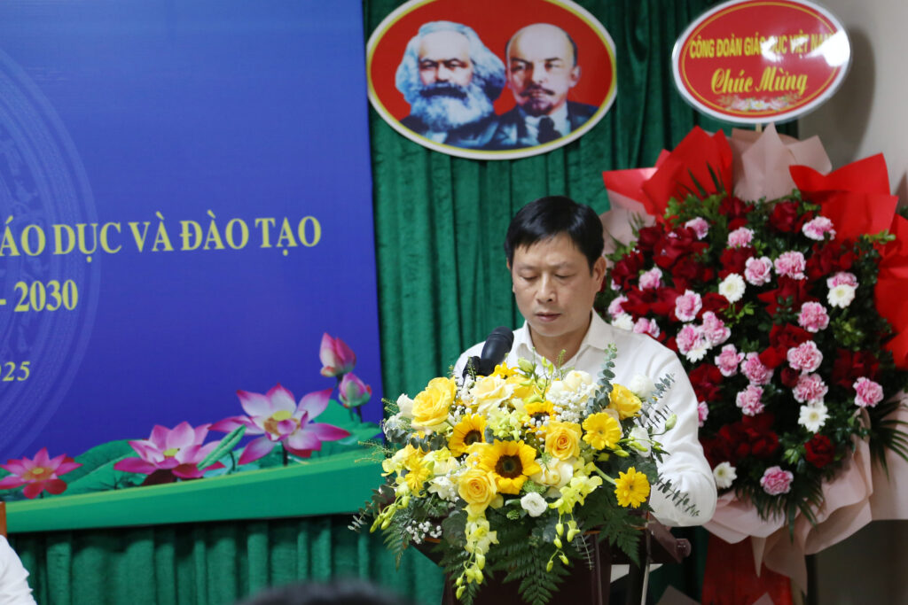 Đồng chí Nguyễn Ngọc Ân – Uỷ viên Ban Chấp hành Đảng bộ Bộ Giáo dục và Đào tạo, Ủy viên đoàn Chủ tịch Tổng Liên đoàn Lao động Việt Nam, Chủ tịch CĐGD Việt Nam (ngoài cùng bên trái) và Đồng chí Nguyễn Ngọc Dũng – Uỷ viên Ban Chấp hành Đảng bộ Bộ Giáo dục và Đào tạo, Bí thư chi bộ, Giám đốc Ban QLCDA tặng hoa chúc mừng Ban Chấp hành Công đoàn nhiệm kỳ 2025-2030.