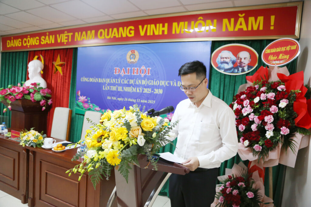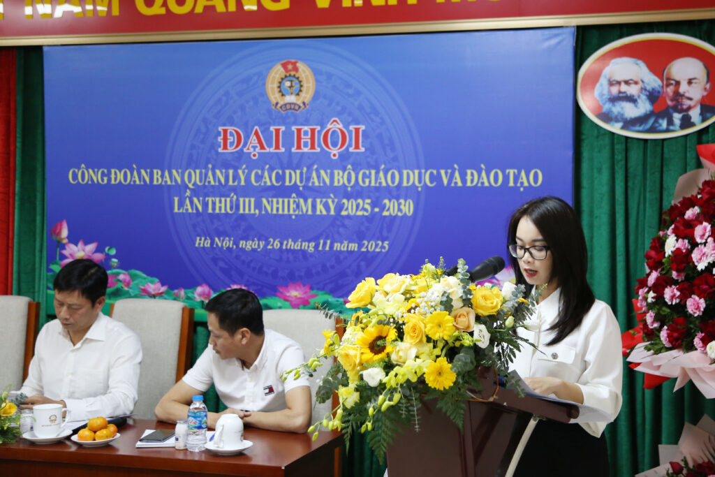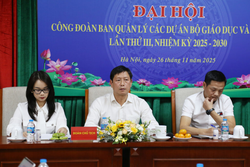 Ngày 26/11, Công đoàn Ban Quản lý các dự án Bộ Giáo dục và Đào tạo (CĐ Ban QLCDA) đã tổ chức thành công Đại hội Công đoàn lần thứ III, nhiệm kỳ 2025-2030. Tham dự chỉ đạo Đại hội có đồng chí Nguyễn Ngọc Ân – Uỷ viên Ban Chấp hành Đảng bộ Bộ Giáo dục và Đào tạo, Ủy viên đoàn Chủ tịch Tổng Liên đoàn Lao động Việt Nam, Chủ tịch CĐGD Việt Nam và đồng chí Đặng Thị Phương Thảo, Ủy viên UBKT Công đoàn Giáo dục Việt Nam.