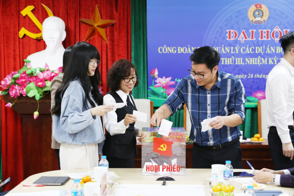 Các đại biểu bỏ phiếu kín bầu Ban Chấp hành Công đoàn Ban QLCDA nhiệm kỳ 2025 – 2030 tại Đại hội